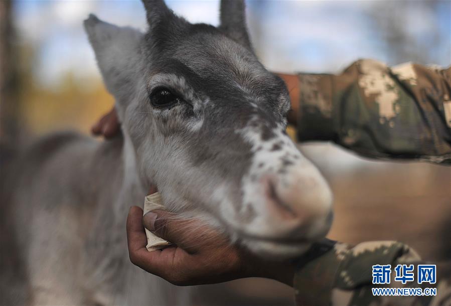 9月18日,在內(nèi)蒙古大興安嶺根河林業(yè)局約安里林場(chǎng),林場(chǎng)職工張國(guó)華愛(ài)撫著馴鹿“混血寶寶”。新華社記者于洋攝