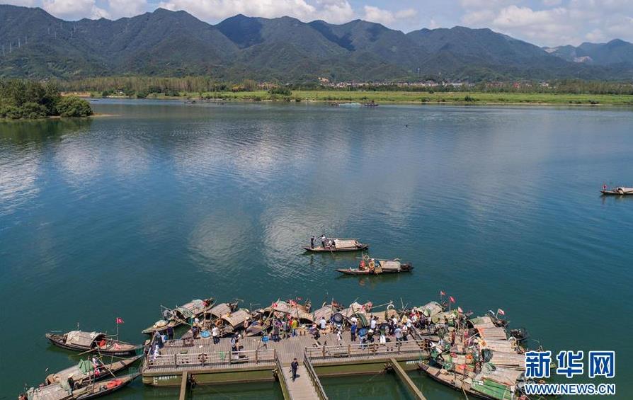 9月18日,漁船陸續(xù)從碼頭出發(fā),行駛到富春江里捕撈江鮮(無人機(jī)拍攝)。