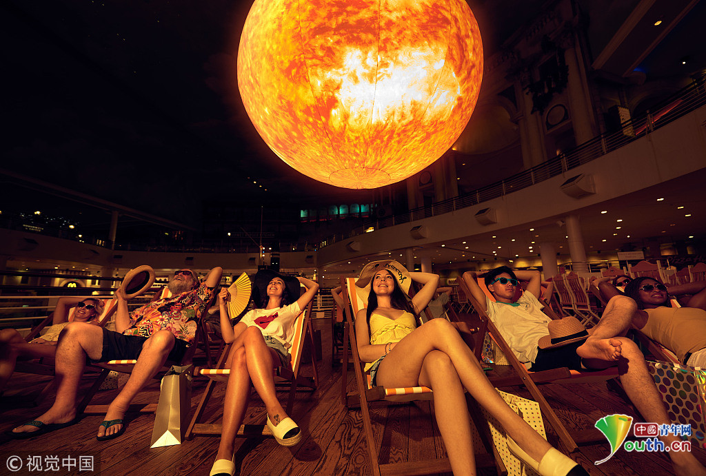 當(dāng)?shù)貢r間2018年9月18日,英國曼切斯特,顧客們在特拉福德購物中心的一個巨型的“太陽”下享受室內(nèi)日光浴,感受英國未完的史上最熱夏天。這個人造“太陽”的亮度相當(dāng)于1.2萬個燈泡。圖片來源:視覺中國