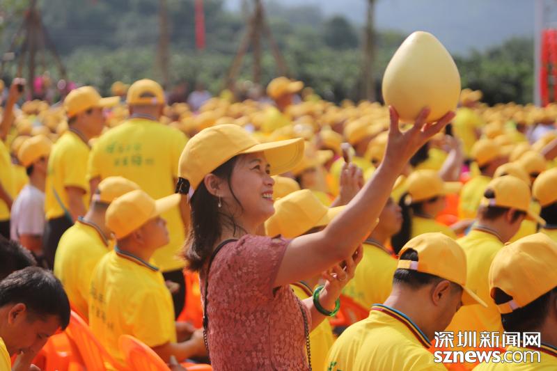 慶祝首屆“中國(guó)農(nóng)民豐收節(jié)”活動(dòng)在梅州大黃村舉行,活動(dòng)期間一名觀眾舉起柚子準(zhǔn)備拍照。