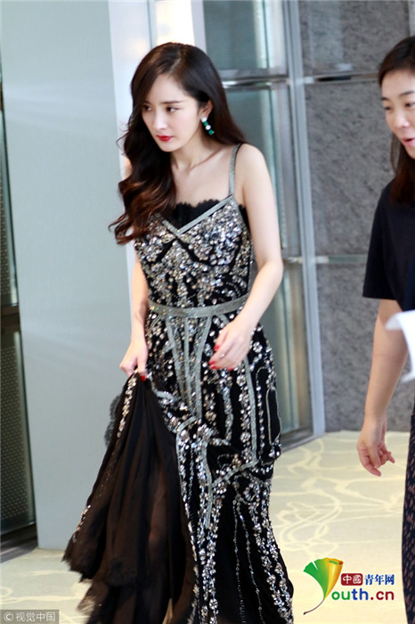楊冪卷發(fā)成熟美露香肩 自提裙擺過(guò)酒店大堂