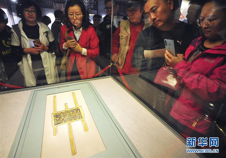 9月24日,在位于烏魯木齊的新疆博物館,參觀者在“尼雅·考古·故事——中日尼雅考古30周年成果展”上觀看“五星出東方利中國”錦護臂。此次展覽從9月22日持續(xù)到2019年1月。新華社記者 王菲 攝