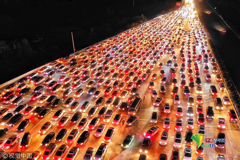航拍鄭州中秋返程高峰 堵車數(shù)公里宛如“巨龍”