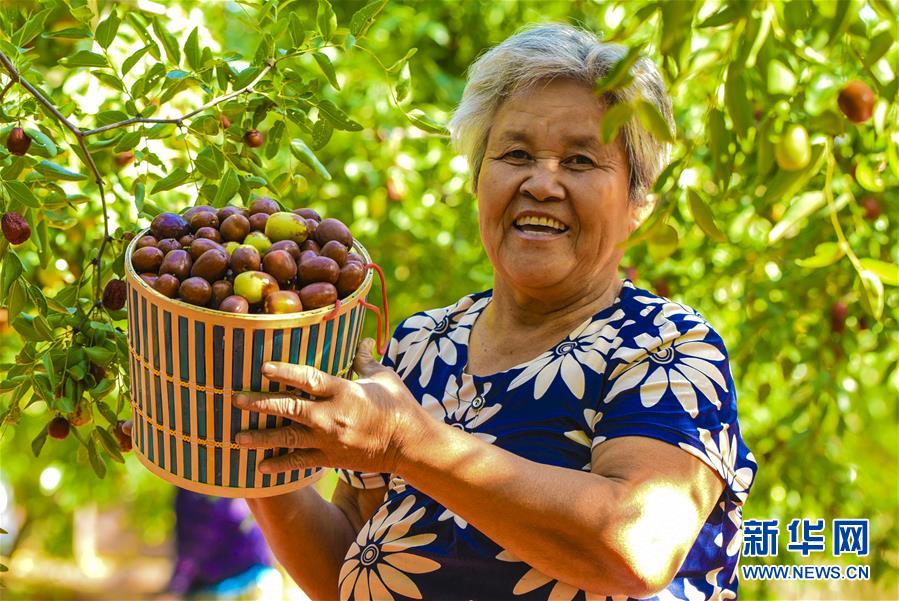 9月22日,河北省棗強(qiáng)縣棗強(qiáng)鎮(zhèn)孟家莊村的棗農(nóng)在展示剛剛收獲的紅棗。 近日,河北省棗強(qiáng)縣的2000多畝棗園迎來收獲季,棗農(nóng)們搶抓農(nóng)時(shí),采摘、篩選、晾曬紅棗,樂享秋收的快樂。 新華社記者李曉果攝