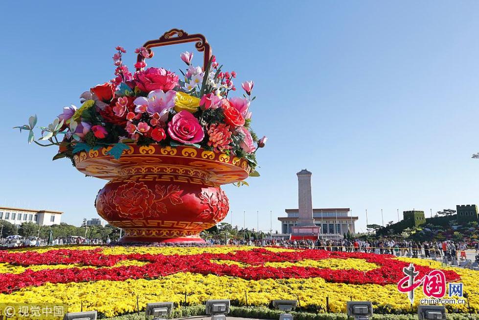 2015年的大花籃規(guī)格與往年相似,花籃依然采用正紅色,同時用金色祥云描邊,提梁為紅色鑲嵌金邊的長方形,頂端再裝飾一朵凸起的祥云。花籃里已經(jīng)有20支左右的花朵,有大紅色的牡丹、玫紅色的月季,再調(diào)和以亮黃色的向日葵,粉色的玉蘭從花籃東側(cè)旁逸斜出,兩束紅梅分別繞著花籃的一側(cè)提梁向上伸展,中間點綴著些粉色桃花?;ɑ@下方放著白花黃蕊的水仙和一些綠色植物,整體配色典雅大氣,富有節(jié)日氣氛。