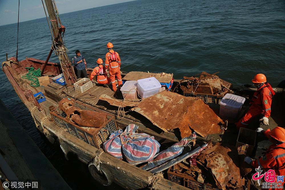 2018年9月25日,遼寧大連,考古工作人員把出水的經(jīng)遠(yuǎn)艦遺物進(jìn)行轉(zhuǎn)運(yùn)。視覺中國