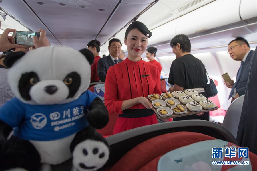 9月26日,在以色列特拉維夫本·古里安國(guó)際機(jī)場(chǎng),四川航空公司空乘人員在機(jī)上展示熊貓主題的小吃。 新華社記者郭昱攝