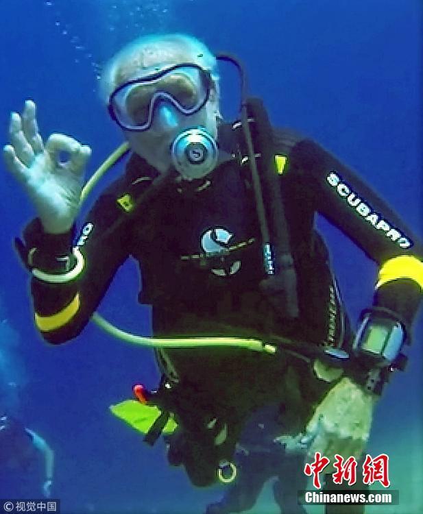 當(dāng)?shù)貢r(shí)間2018年9月1日,塞浦路斯,95歲的英國(guó)潛水員雷·伍利(Ray Woolley)以44分鐘下潛40.5米的成績(jī)打破了自己94歲達(dá)成的記錄(41分鐘下潛38.1米),二度刷新了世界上年齡最大的男性潛水員最好成績(jī)。在此次下潛中,這位二戰(zhàn)退伍老兵對(duì)距塞浦路斯南部城鎮(zhèn)拉納卡約2公里處的海域進(jìn)行了探索,1980年一艘名為“芝諾比亞號(hào)”(Zenobia)的貨船在這里進(jìn)行首次航行時(shí)沉沒(méi)。圖片來(lái)源:視覺(jué)中國(guó)