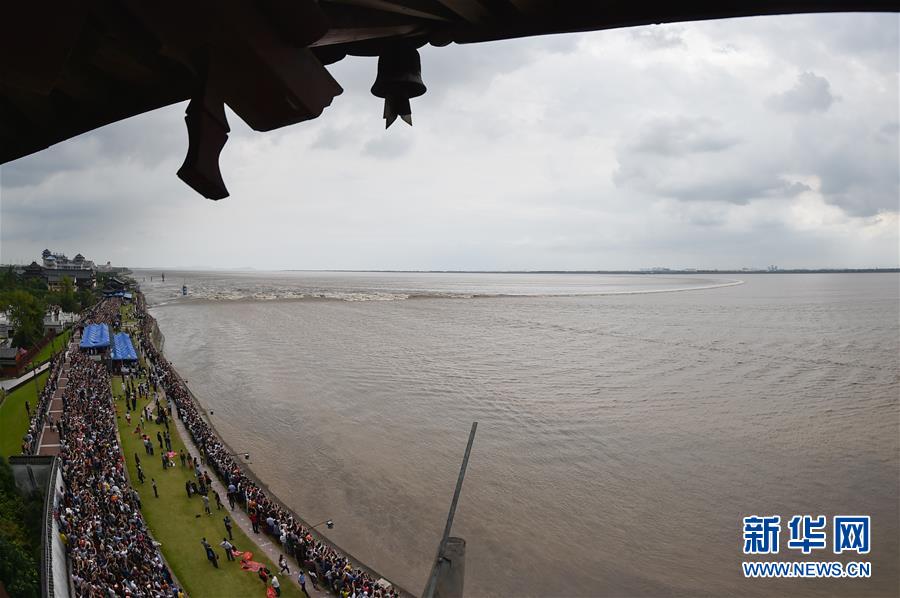 9月27日在浙江海寧市鹽官鎮(zhèn)占鰲塔上拍攝的錢塘江“一線潮”。當日是農(nóng)歷八月十八,號稱“天下第一潮”的錢塘江大潮洶涌而來,眾多錢塘江沿岸居民和游客爭睹其壯觀景象。新華社記者 黃宗治 攝