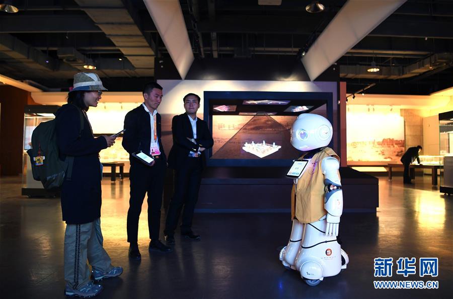 9月27日,在敦煌國際會展中心,機(jī)器人為參觀者講解“古道天馬——絲綢之路上的交通”展覽。 新華社記者范培珅攝