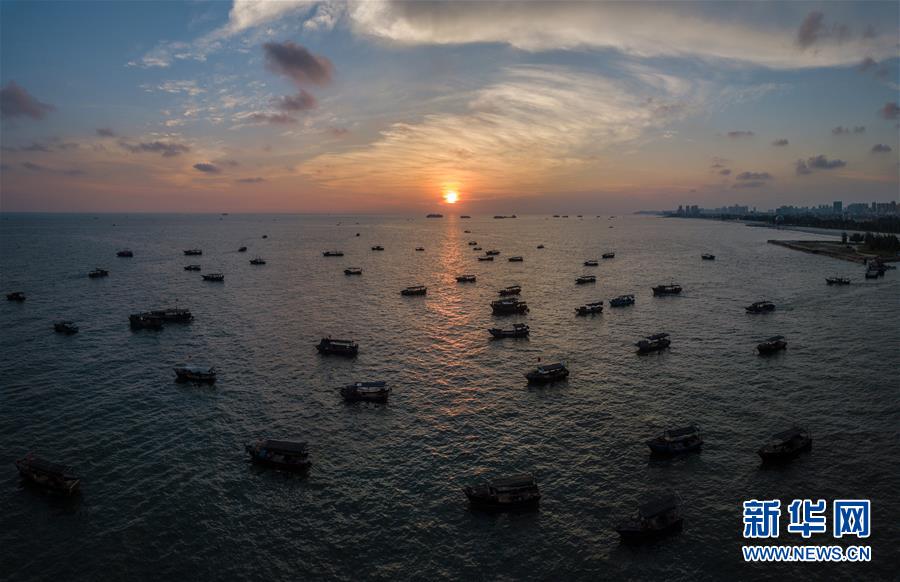 這是夕陽西下時,漁船從廣西北海市銀灘風(fēng)景區(qū)出海作業(yè)(9月26日無人機(jī)拍攝,拼接照片)。 新華社記者 李鑫 攝