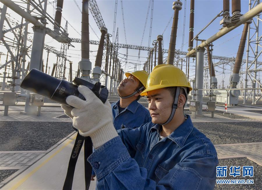 在吐魯番市750千伏變電站,兩位工作人員利用專用設(shè)備對電力設(shè)施進行檢查(9月18日攝)。新華社記者趙戈 攝