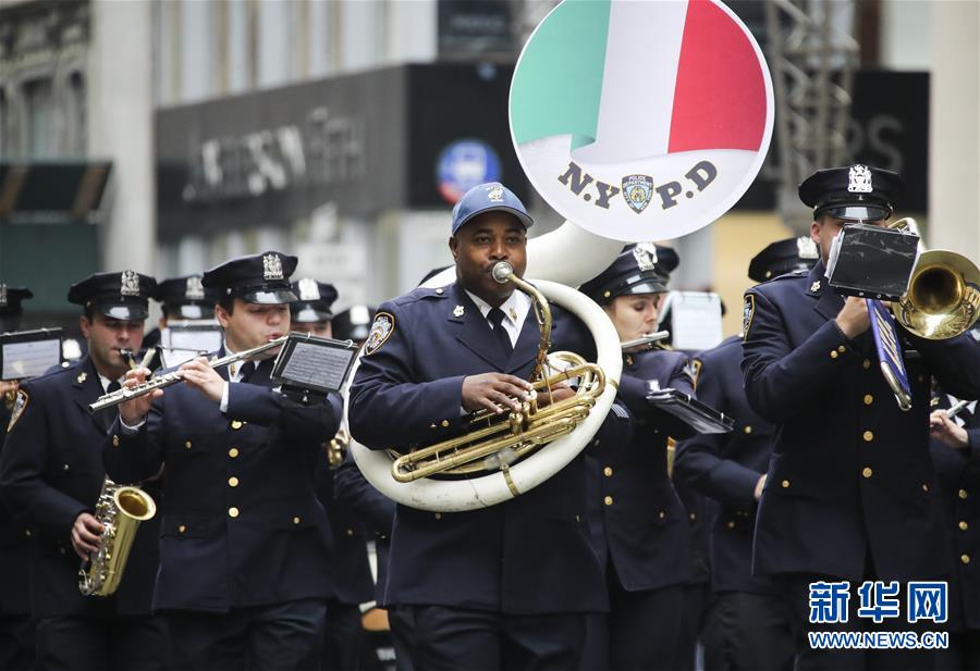 10月8日,在美國(guó)紐約曼哈頓第五大道,紐約警察樂隊(duì)參加哥倫布日游行。 新華社記者王迎攝