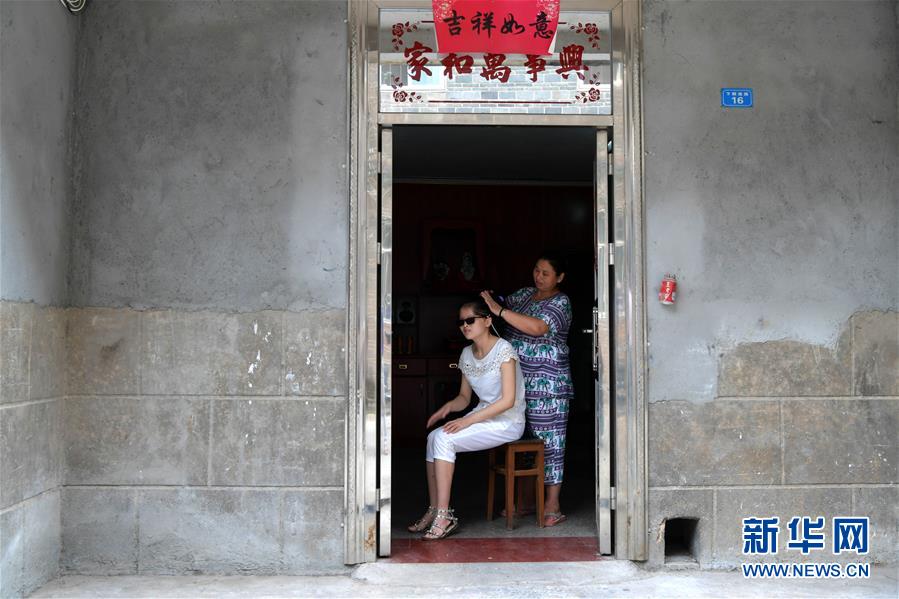 楊虹的母親謝年華(右)在家中給她扎辮子(9月26日攝)。新華社記者 彭昭之 攝