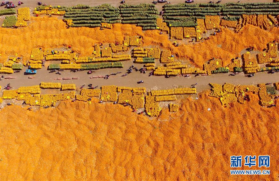 10月14日,河北省南和縣閆里鄉(xiāng)閆里村農(nóng)民在晾曬收獲的玉米(無人機拍攝)。
