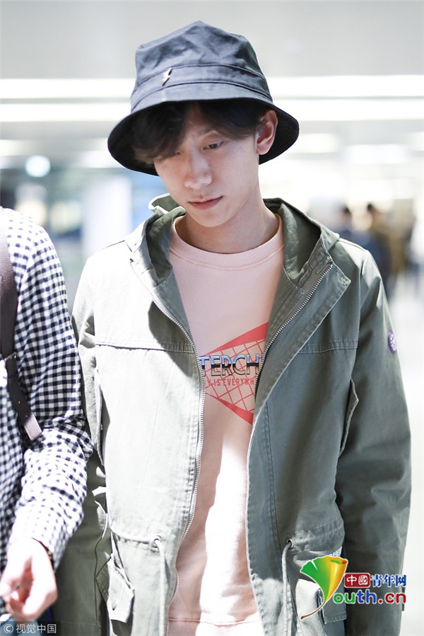 2018年10月14日,上海,張一山抵達(dá)上海機場。張一山戴漁夫帽眼袋嚴(yán)重瞬間老十歲, 用手擋臉?biāo)撇辉干乡R。