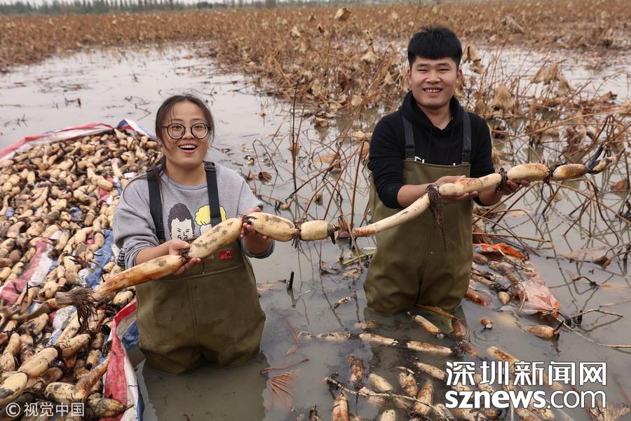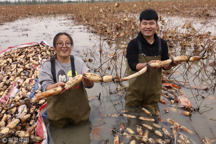 2018年10月14日,江蘇宿遷,泗洪縣曹廟鄉(xiāng)瓦廟村村民在藕蝦共作基地參加挖藕比賽。