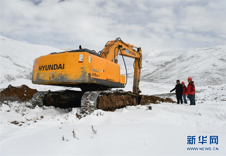 工作人員駕駛大型機械在昌都市江達(dá)縣的高山牧場上搶通道路(10月14日攝)。新華社記者 劉東君 攝