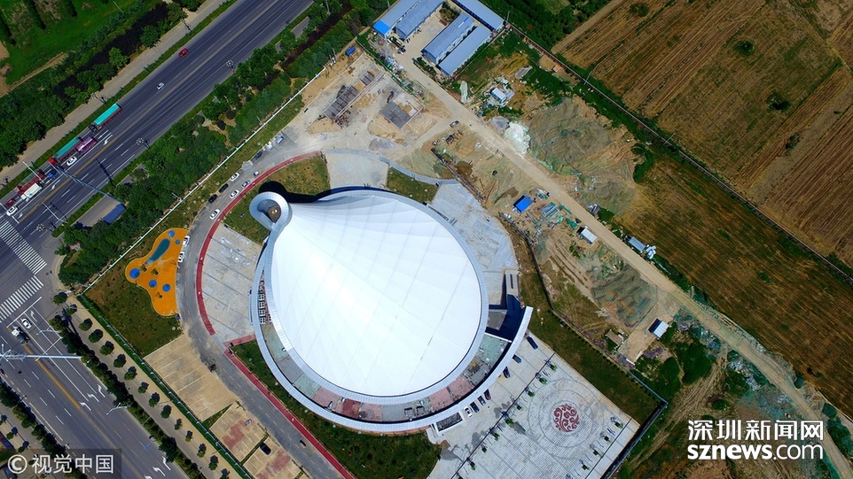 2018年6月13日,航拍河南淮陽一座即將竣工落成的體育場館建筑,市民稱酷似一個石磨盤。