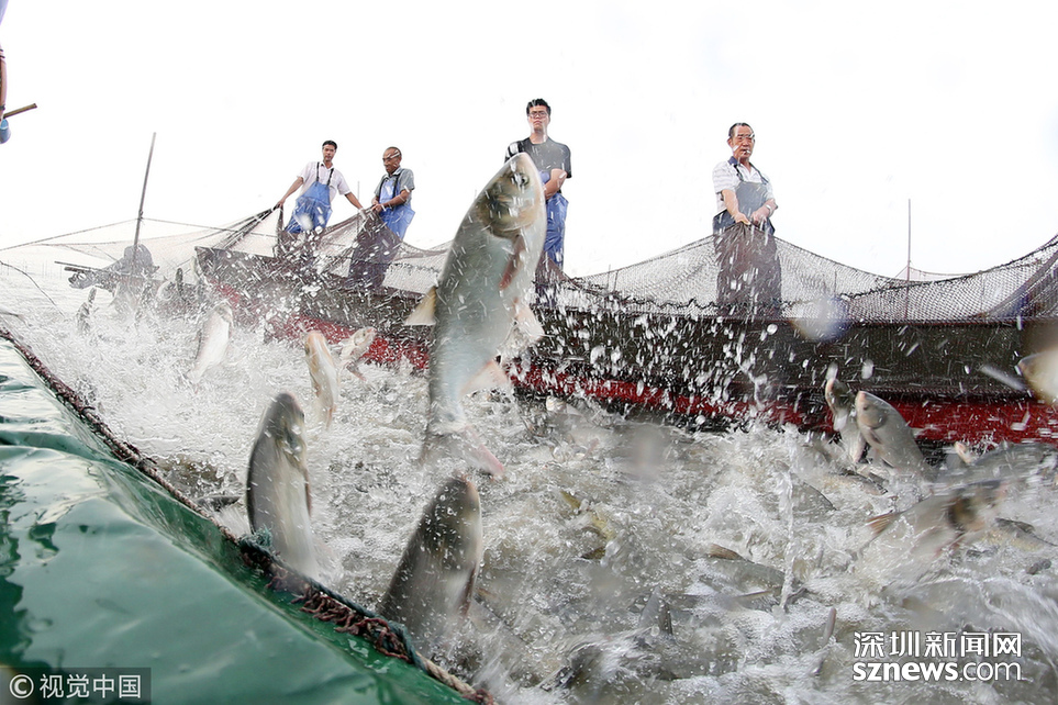 2018年6月26日,江蘇省常州市嘉澤鎮(zhèn)捕撈村的漁民組織夏季捕撈,一網(wǎng)魚達(dá)五萬余斤,以鰱魚為主,供應(yīng)市場(chǎng)需求。夏捕的魚價(jià)較平時(shí)有所上漲,漁民粗略估計(jì)可增收上萬余元。