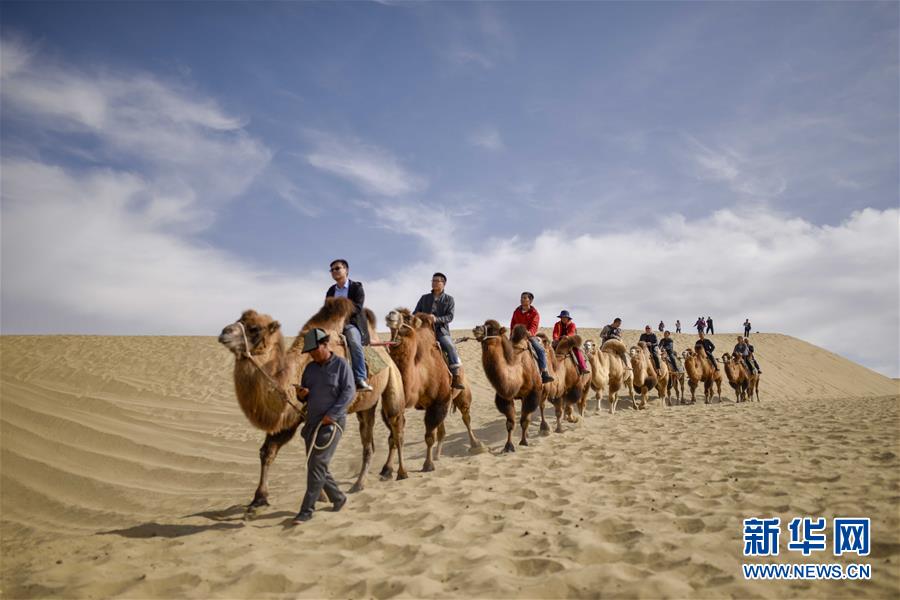 10月16日,游客在羅布人村寨里騎著駱駝?dòng)斡[。
