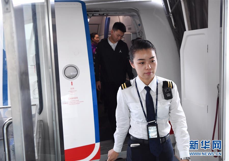 10月16日,湯春燕對飛機客艙進行安保檢查。 新華社記者王全超攝
