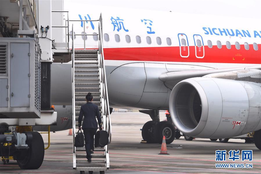 10月16日,航班抵達重慶江北國際機場后,湯春燕第一個走出艙門,準備迎接旅客下機。 新華社記者王全超攝