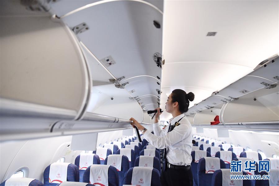 10月16日,湯春燕對飛機(jī)客艙進(jìn)行安保檢查。 新華社記者王全超攝