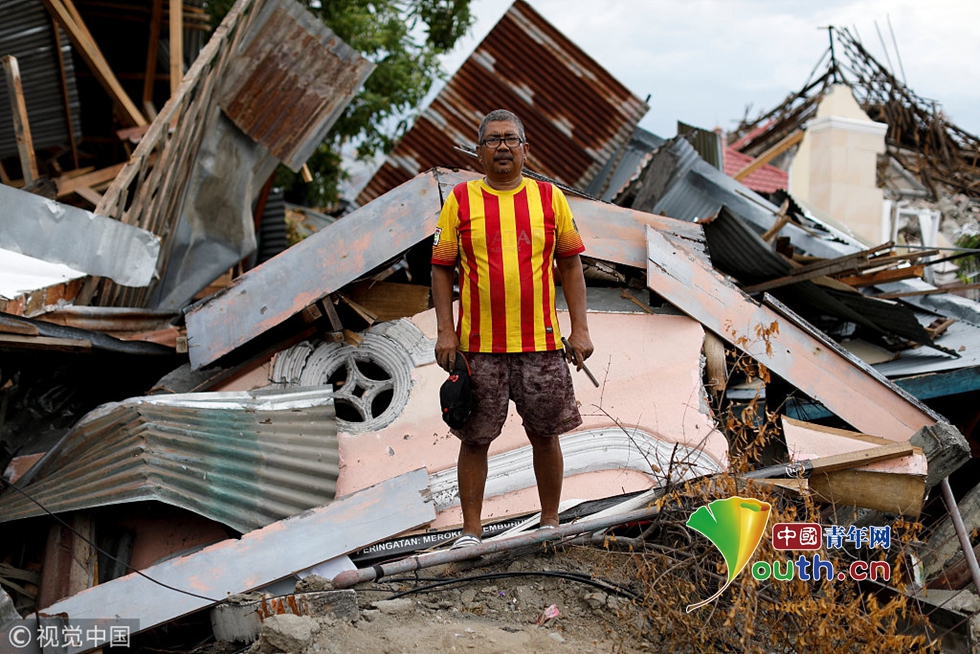 當(dāng)?shù)貢r間2018年10月11日,印尼帕盧,43歲的農(nóng)民Ahmad在廢墟旁邊,這里曾經(jīng)是他的家。他希望能找到妻子和兩個女兒的遺體。他的三女兒被發(fā)現(xiàn)時受了重傷,現(xiàn)在正在醫(yī)院接受治療。