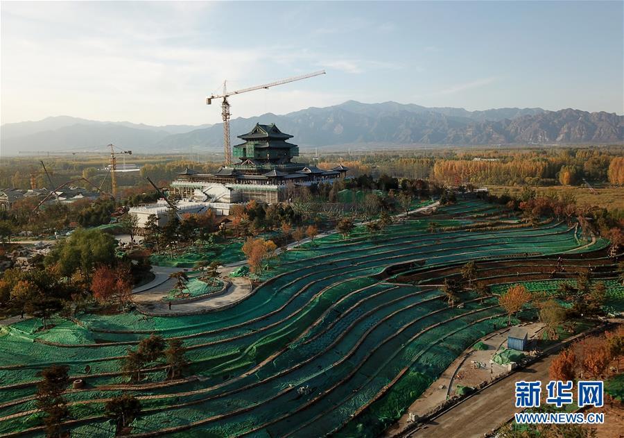 10月18日拍攝的建設(shè)中的北京世園會永寧閣(無人機拍攝)。 新華社記者 羅曉光 攝