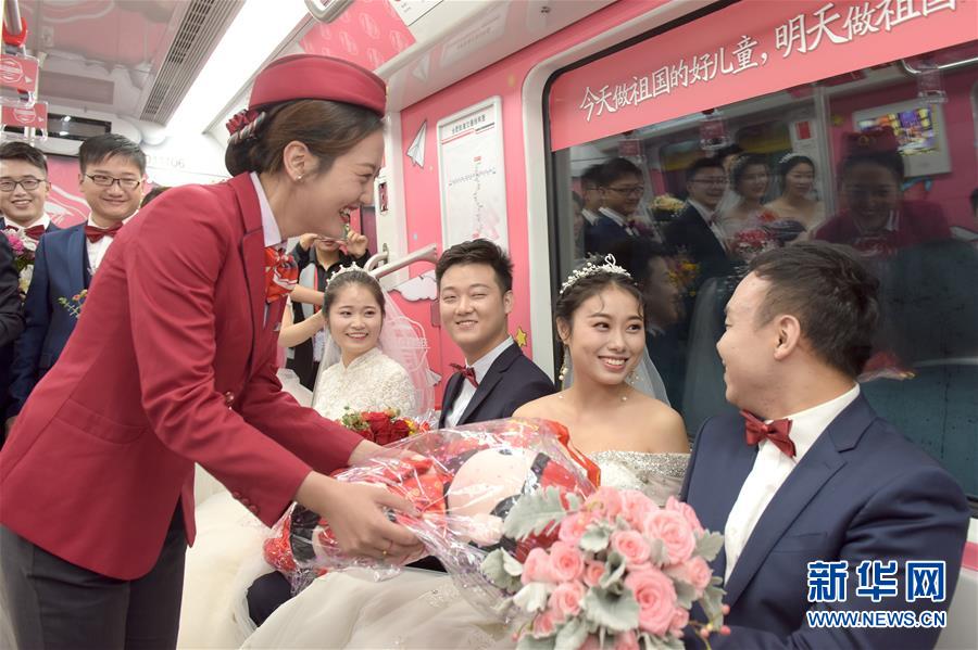10月18日,在合肥市地鐵一號線車廂內(nèi),地鐵工作人員向新人們送禮物。當日,中鐵四局集團城市軌道交通工程分公司的18對新人在安徽合肥地鐵一號線的車廂里舉行了一場集體婚禮儀式。 新華社記者 郭晨 攝