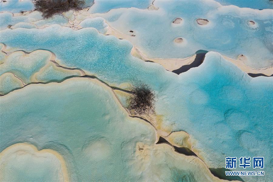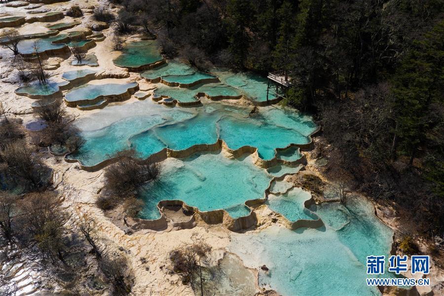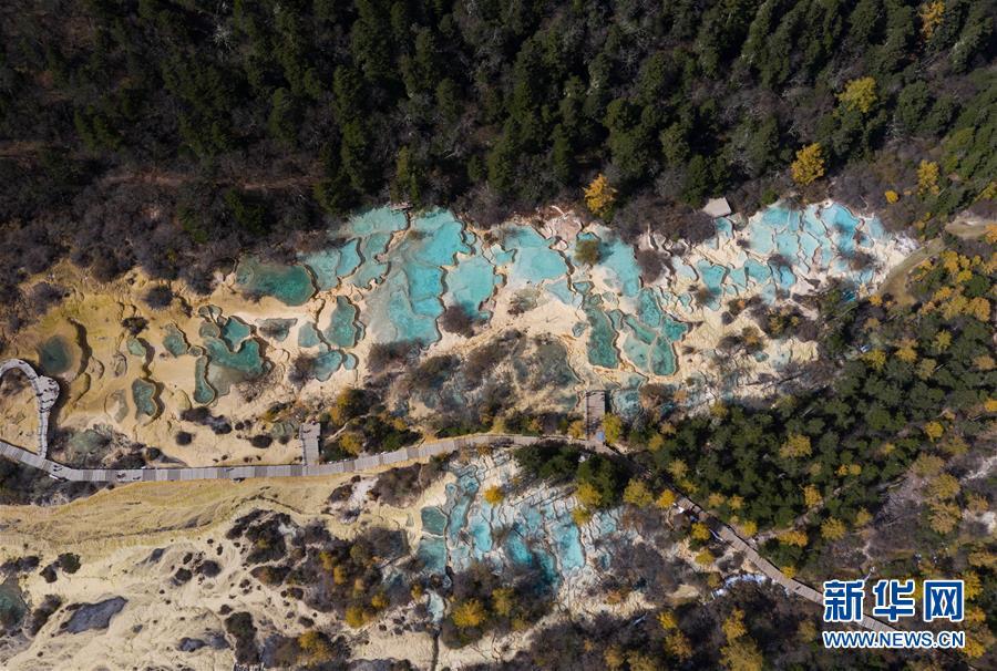 俯瞰黃龍溝爭艷池一角(10月19日無人機拍攝)。深秋時節(jié),在雪山、藍天、白云和彩林映襯下,黃龍溝中的彩池色彩更加斑斕,目前黃龍景區(qū)進入觀賞最佳時節(jié)。黃龍風(fēng)景名勝區(qū)位于四川省松潘縣境內(nèi),以彩池、灘流、雪山、峽谷、森林等聞名,享有“人間瑤池”“圣地仙境”之美譽。新華社記者 江宏景攝