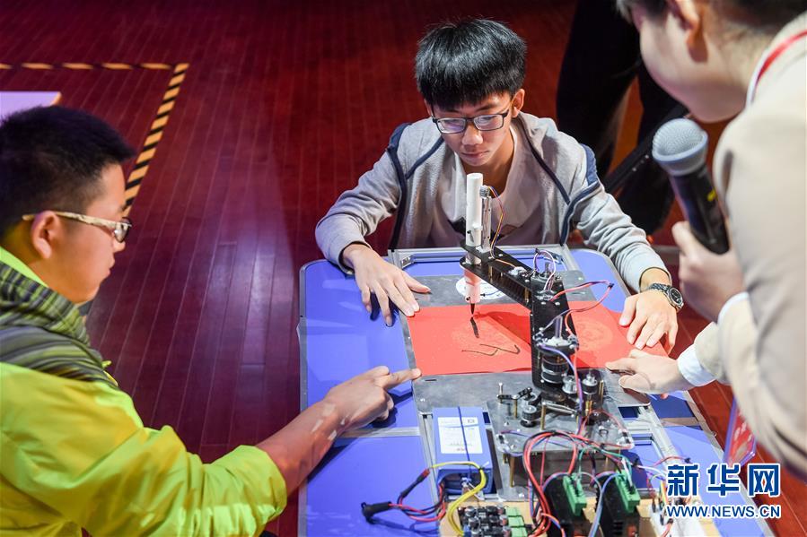 10月21日,在位于安徽合肥的中國科學(xué)技術(shù)大學(xué),“人五成影”隊(duì)帶著皮影戲機(jī)器人參加比賽。新華社記者張端攝