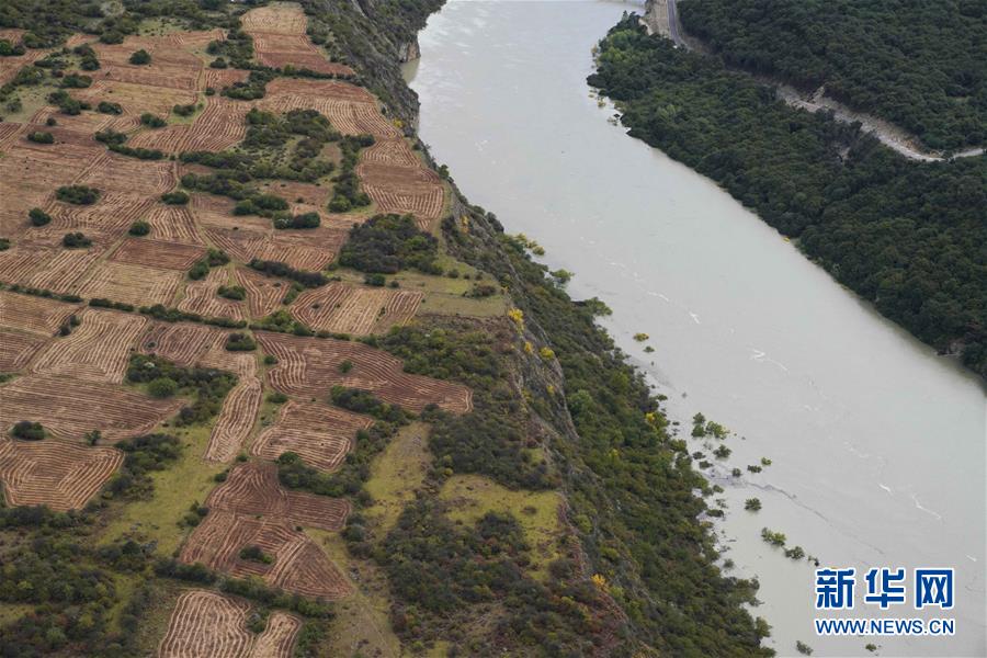 空中俯瞰通往加拉村已淹沒的公路(10月18日攝)。  新華社記者 普布扎西攝