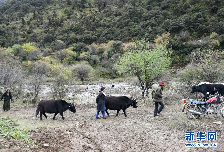 波羅鄉(xiāng)一臨時過渡安置點內的群眾在放牛(10月14日攝)。 新華社記者 劉東君 攝