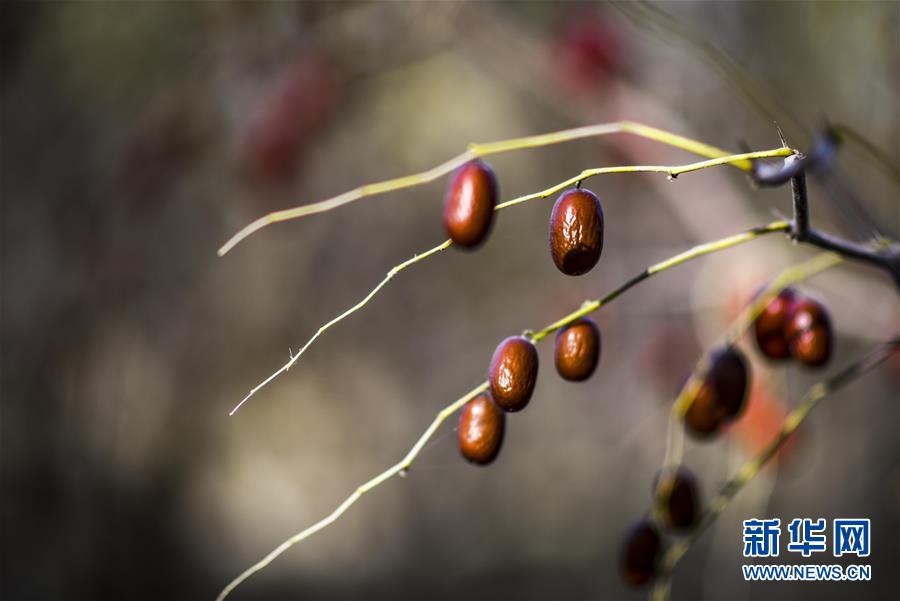 10月20日,在且末縣阿熱勒鎮(zhèn)有機(jī)紅棗園里,成熟的紅棗掛在枝頭。 新華社記者 趙戈 攝