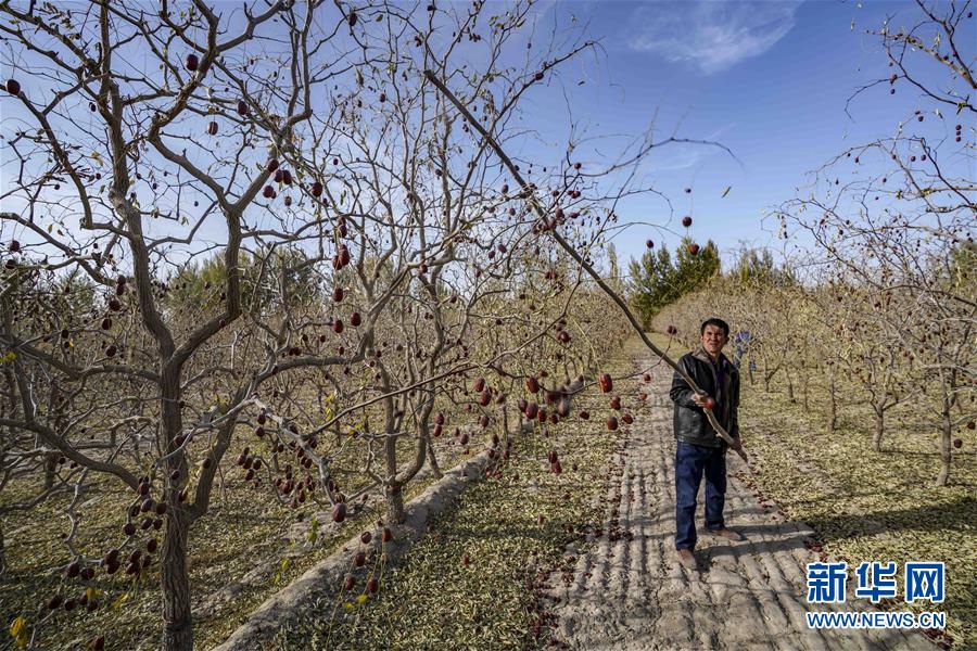 10月20日,在且末縣阿熱勒鎮(zhèn)有機(jī)紅棗園里,棗農(nóng)在打棗。 新華社記者 趙戈 攝