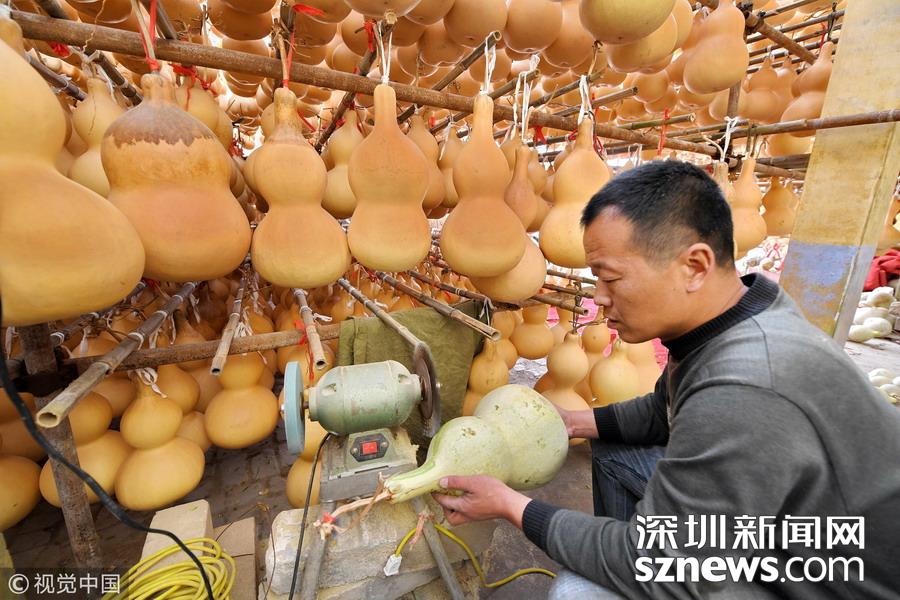 山西聞喜縣禮元鎮(zhèn)阜底村農(nóng)民趙雙慧對葫蘆進(jìn)行削皮處理。