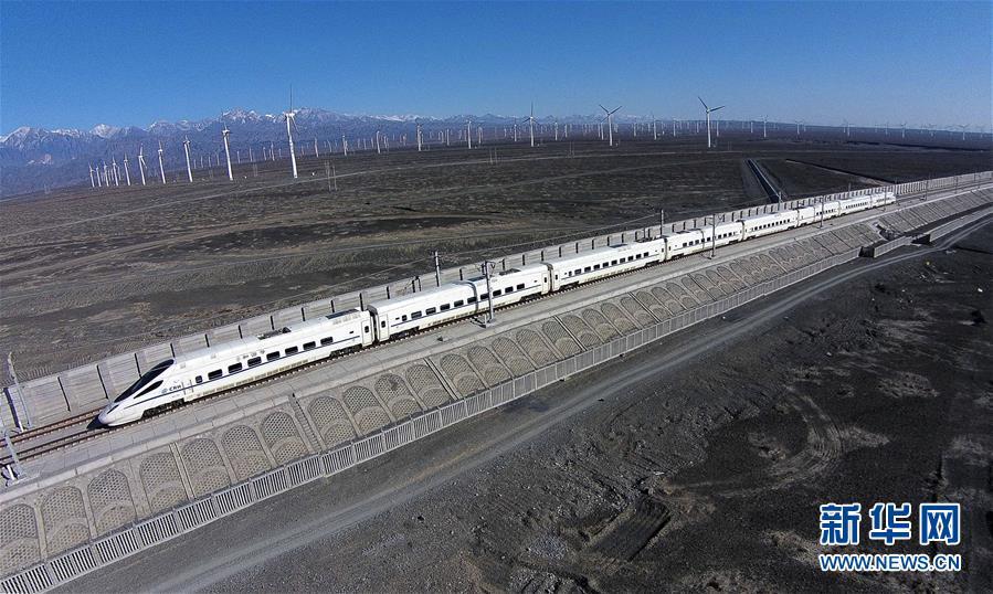 一輛和諧號動車穿行在新疆烏魯木齊達坂城風力發(fā)電場的“風車森林”里(2014年11月16日無人機拍攝)。今年以來,新疆穩(wěn)步推進新能源參與“疆電外送”、擴大與燃煤自備電廠調(diào)峰替代交易等多種電力交易方式,著力破解“綠色電力”上網(wǎng)難題,新能源發(fā)電量同比增加近13個百分點,而棄電量和棄電比實現(xiàn)“雙降”,綠色發(fā)展理念進一步落實。 新疆是我國重要的能源供應和儲備基地,風能、太陽能儲量豐富。近年來,新疆新能源裝機總量突破2700萬千瓦,規(guī)模和占比均居全國前列。新華社記者 江文耀 攝
