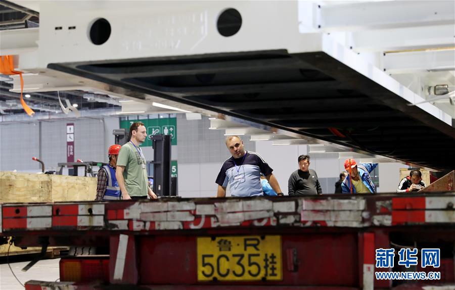 10月22日,德國工程師馬丁·霍爾茨海德(中)在吊裝過程中查看“金牛座”龍門銑床床身位置。 當(dāng)日,來自德國的首屆進(jìn)口博覽會(huì)最大展品——“金牛座”龍門銑床完成初步組裝,將運(yùn)往國家會(huì)展中心(上海)3號(hào)館進(jìn)行最后的安裝施工。這是德國瓦德里??票す狙邪l(fā)的機(jī)床設(shè)備,高約8米,占地面積約200平方米,將在智能及高端裝備區(qū)進(jìn)行展出。 新華社記者方喆攝