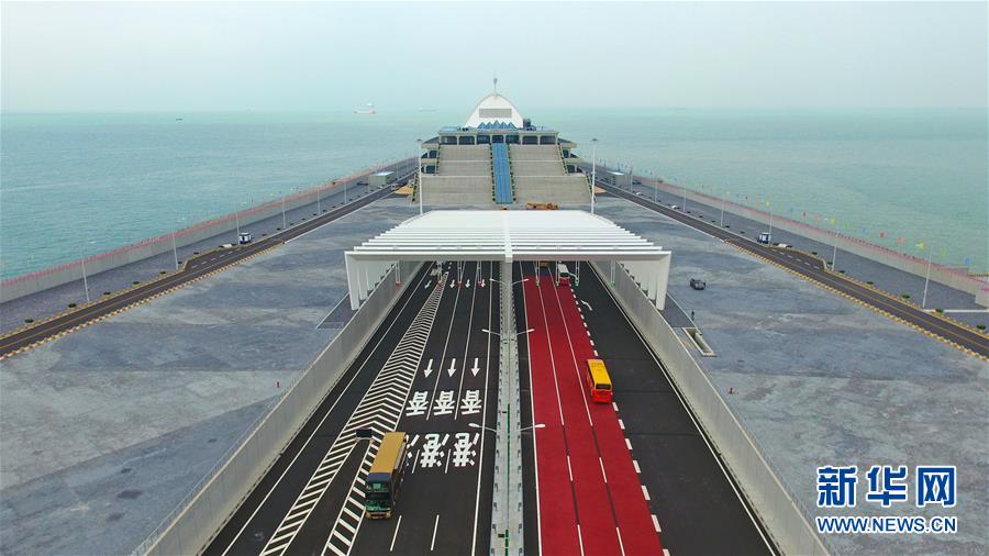 10月24日,來往車輛在東人工島上出入海底隧道(無人機(jī)拍攝)。 當(dāng)日,港珠澳大橋正式通車。