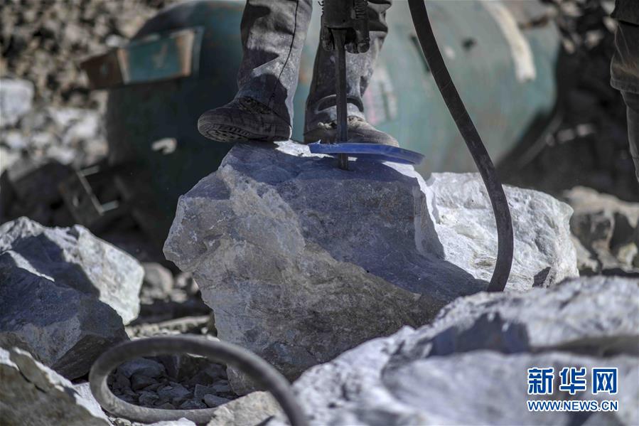 在興發(fā)達(dá)玉礦,一位采玉師傅在一塊玉石上打眼,便于觀察玉石品質(zhì)(10月23日攝)。 新華社記者趙戈攝