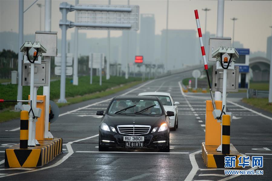 10月24日,首輛私家車在澳門口岸離境車道上通關(guān)。當(dāng)日9時(shí),港珠澳大橋正式通車。 新華社記者張金加攝