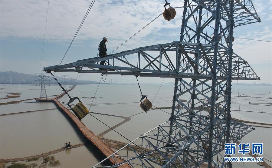 10月25日,埭頭風(fēng)電送出工程施工人員在跨平海灣段的鐵塔上作業(yè)(無人機拍攝)。 新華社記者林善傳攝