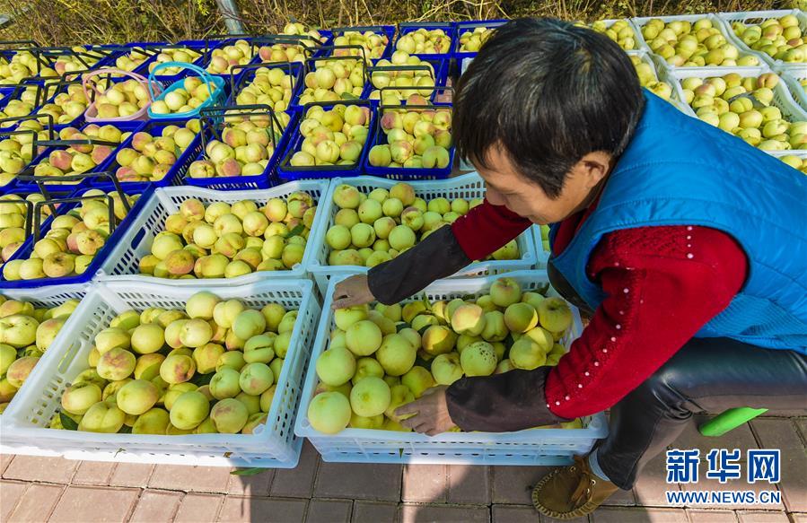 10月29日,河北省故城縣盛嘉莊園的工作人員在分選冬桃。 新華社記者 李曉果 攝