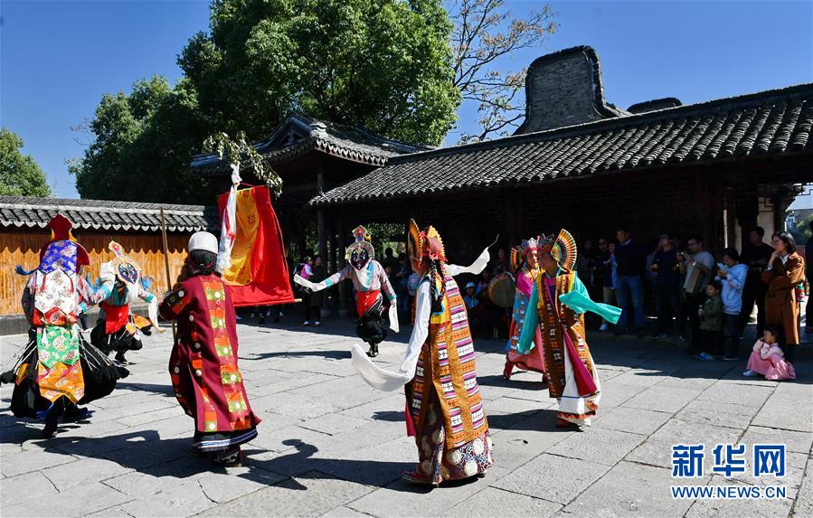在浙江烏鎮(zhèn)西柵景區(qū)的安渡坊碼頭廣場(chǎng)上,西藏迥巴藏戲隊(duì)表演藏戲《頓月頓珠》(10月28日攝)。 新華社記者 張汝鋒 攝