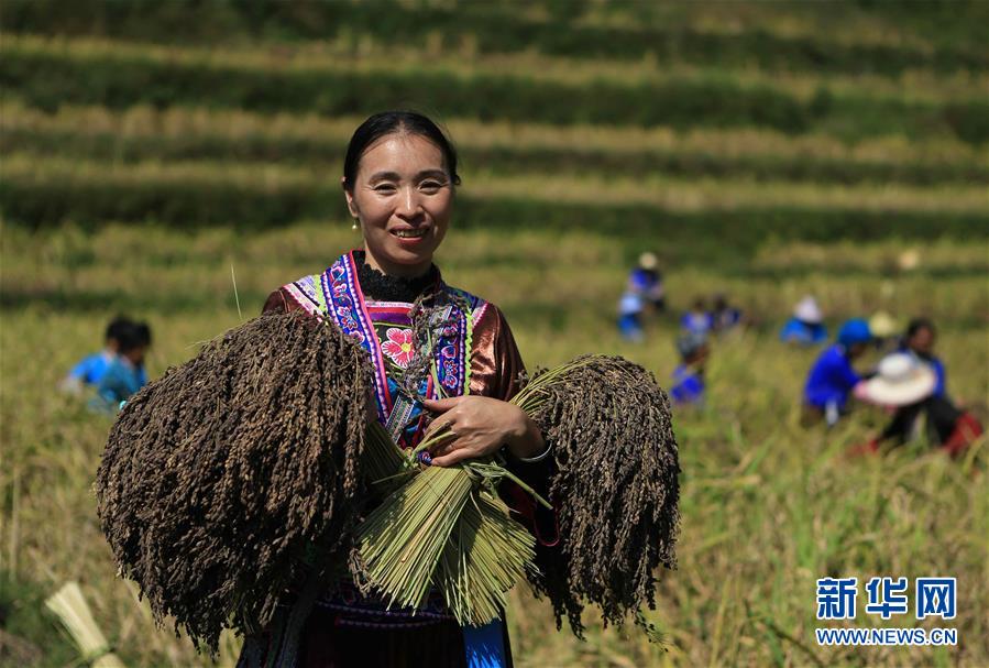 10月30日,在廣西融水苗族自治縣安太鄉(xiāng)元寶村,村民在收獲香糯。 新華社記者 吳建路 攝