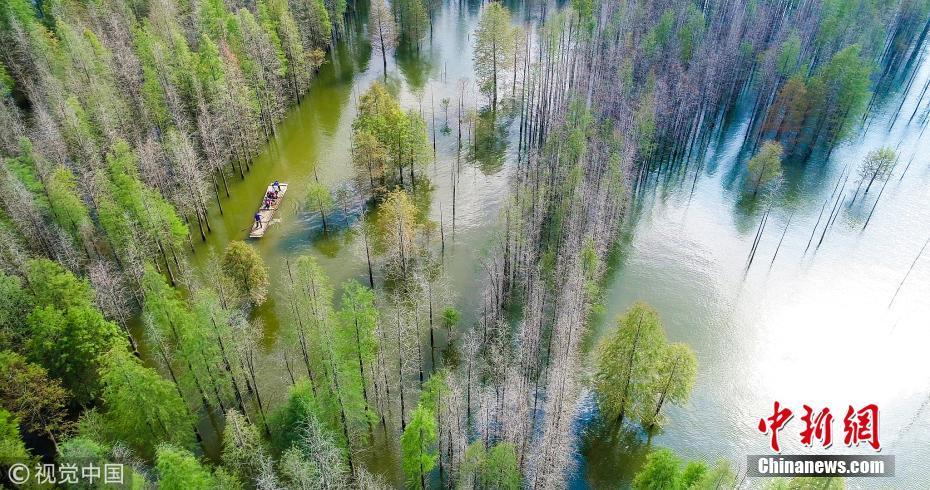 10月5日,航拍安徽宣城寧國方塘鄉(xiāng)汪村青龍湖港口灣水庫,游客們泛舟湖上,穿梭于紅杉林中,享受秋日的美好時(shí)光。 圖片來源:視覺中國