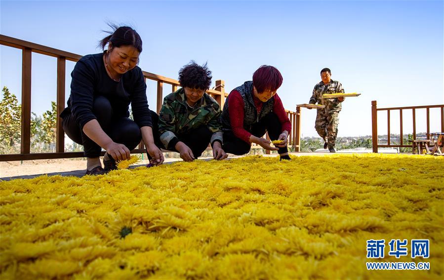 10月30日,武安市午汲鎮(zhèn)東河下村村民在晾曬菊花。