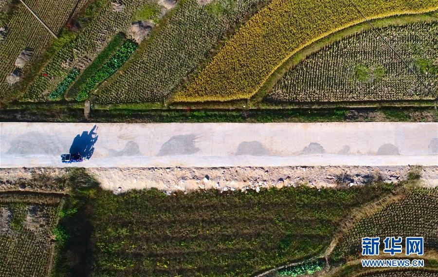10月30日,曾紀(jì)連載著電影放映設(shè)備穿過稻田,準(zhǔn)備為村民們放映電影(無人機(jī)拍攝)。新華社記者 胡晨歡攝